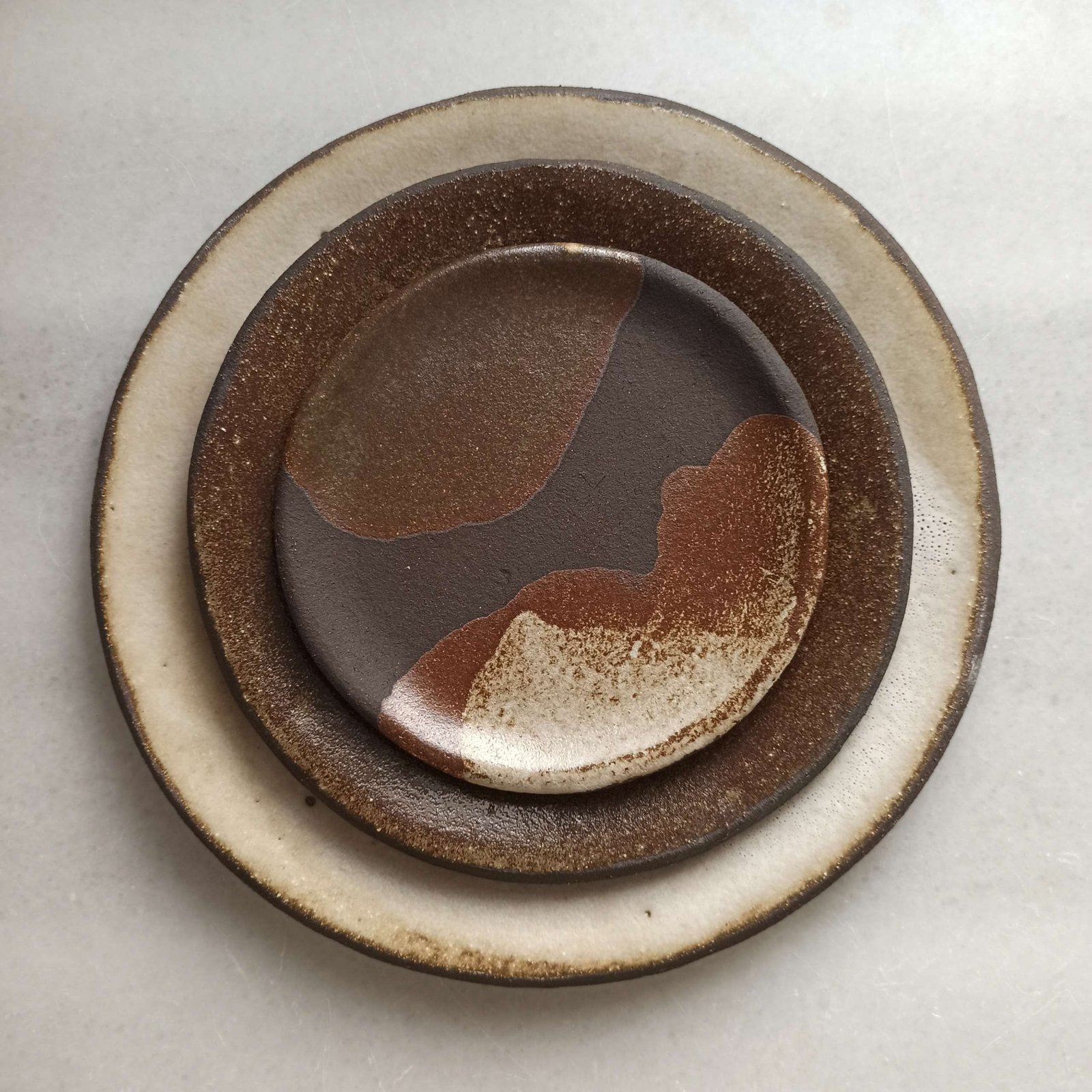 Juego de tres platos de barro negro de diferentes tamaño. Precio por los tres.
